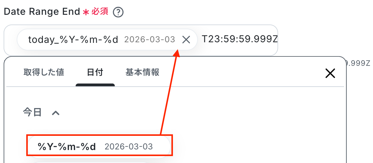 「Date Range Start」と「Date Range End」では、日付の範囲を設定します。 「Date Range Start」に、ステップ4の「日時・日付の加算減算設定で取得した値を引用して設定しましょう。