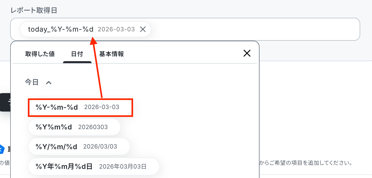 「レポート取得日」には、日付変数を使用して設定してください。 日付変数を設定することで、フローボットを起動した日時が自動で反映されます。日付変数について