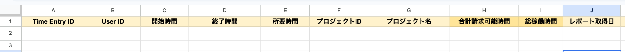 テーブル範囲は、ヘッダーがテーブル範囲内に含まれるように設定しましょう。 ステップ7の繰り返し処理の設定で取得した値を、Google スプレッドシートに反映させるため、以下のシートを使用します。 ここでは、「A1:J」と設定します。 ※なお、「レポート取得日」を設定することで、取得した日時を反映させることができます。