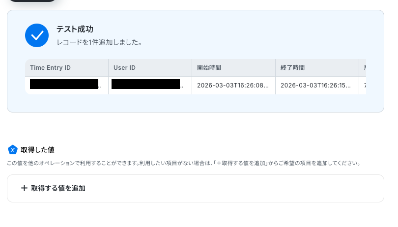 次の画面で「追加するレコードの値」 を設定します。 各項目には、Clockifyのオペレーションで取得した値から設定してください。