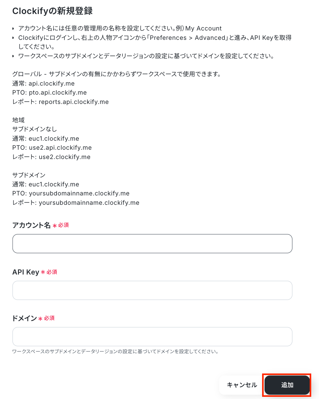 アカウント名は任意のものを入力してください。 APIキーはClockifyのアカウント設定ページから簡単に取得できます。 ドメインは入力欄下の注釈を参照して入力しましょう。
