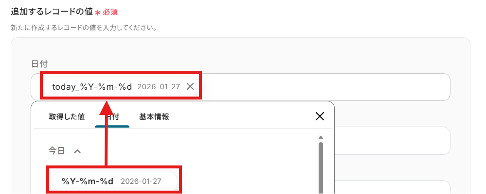 「追加するレコードの値」を設定します。 今回は「日付」と「取得した値」のループ変数を用いて以下のように設定しました! 取得した値は変数となり固定値ではないため、トリガーが実行されるたびに取得した情報を反映できます。