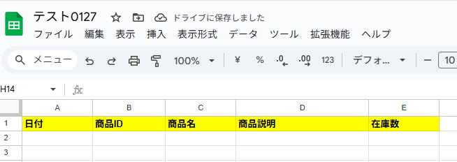 今回のフローで使用したいGoogle スプレッドシートの準備がまだの方は作成しておきましょう。 例として以下のように作成しました!