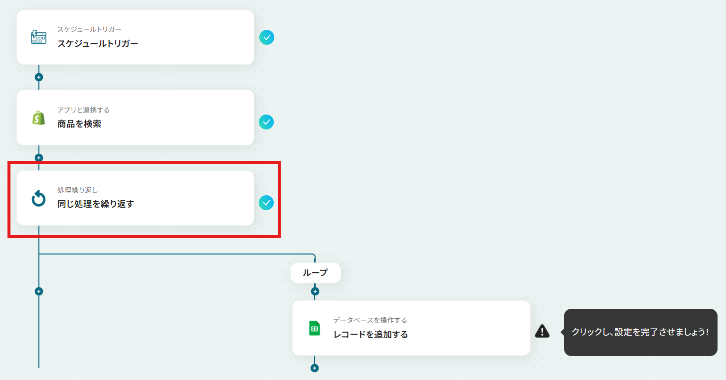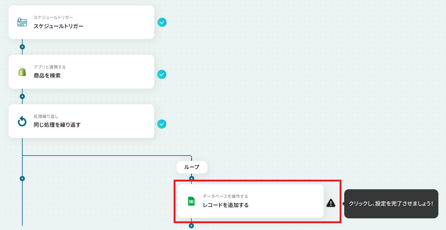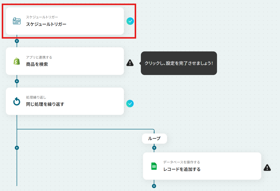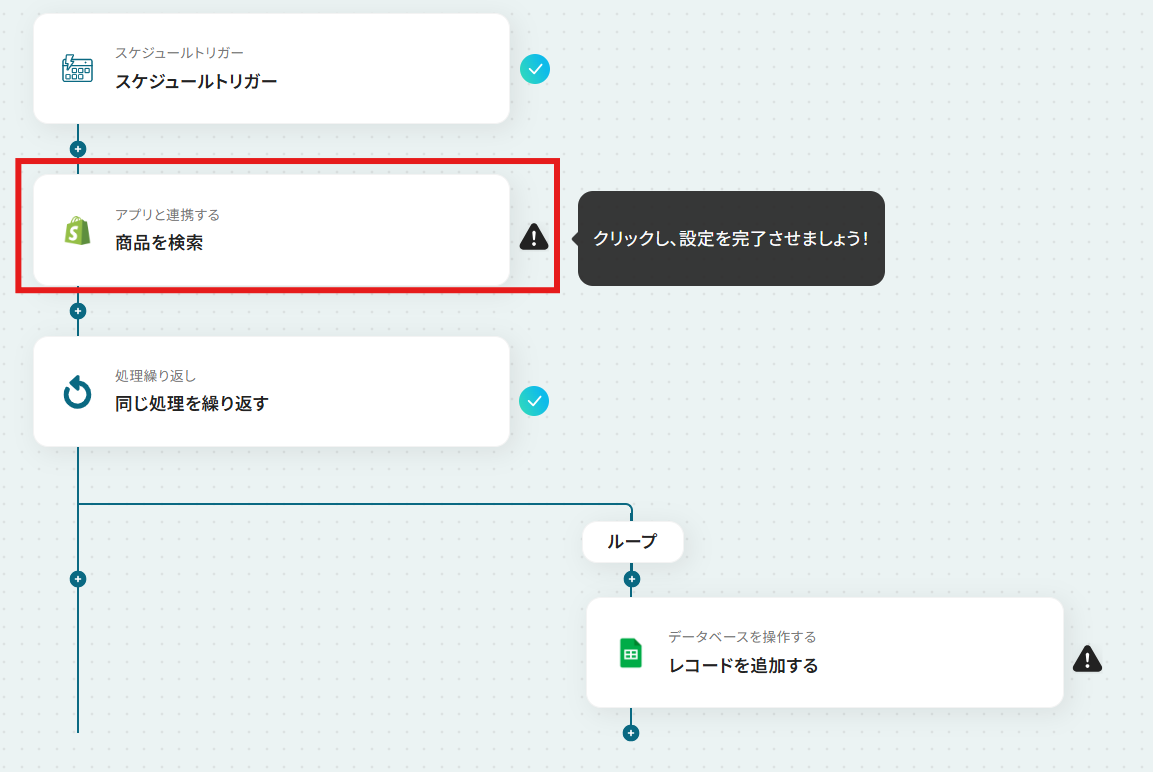 スケジュールトリガー機能では、フローを実行したい頻度や日時を任意で設定してください Shopifyの検索アクションでは、取得する商品のステータスなど、条件を任意の値に設定することが可能です 繰り返し処理では、前段のShopifyのアクションで取得した商品一覧のデータを変数として設定してください Google スプレッドシートへのレコード追加アクションでは、出力先のスプレッドシートファイルやシート、書き込みたい範囲などを任意で設定してください ■注意事項