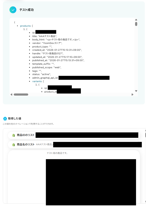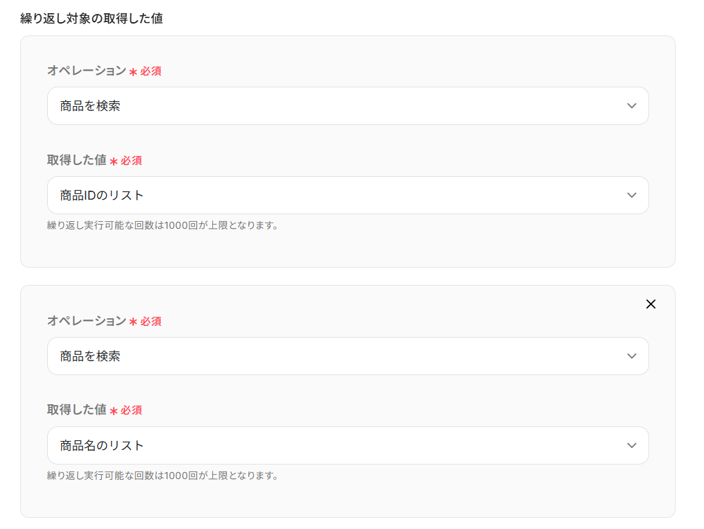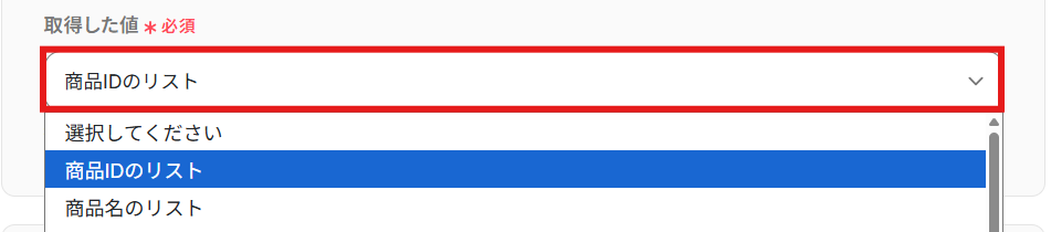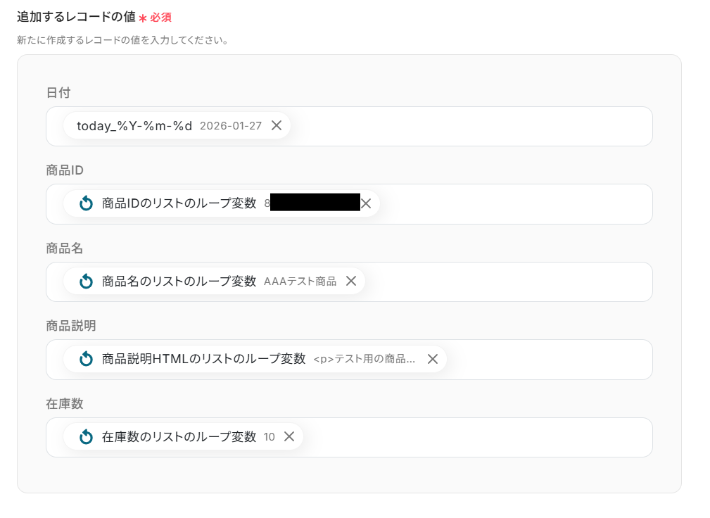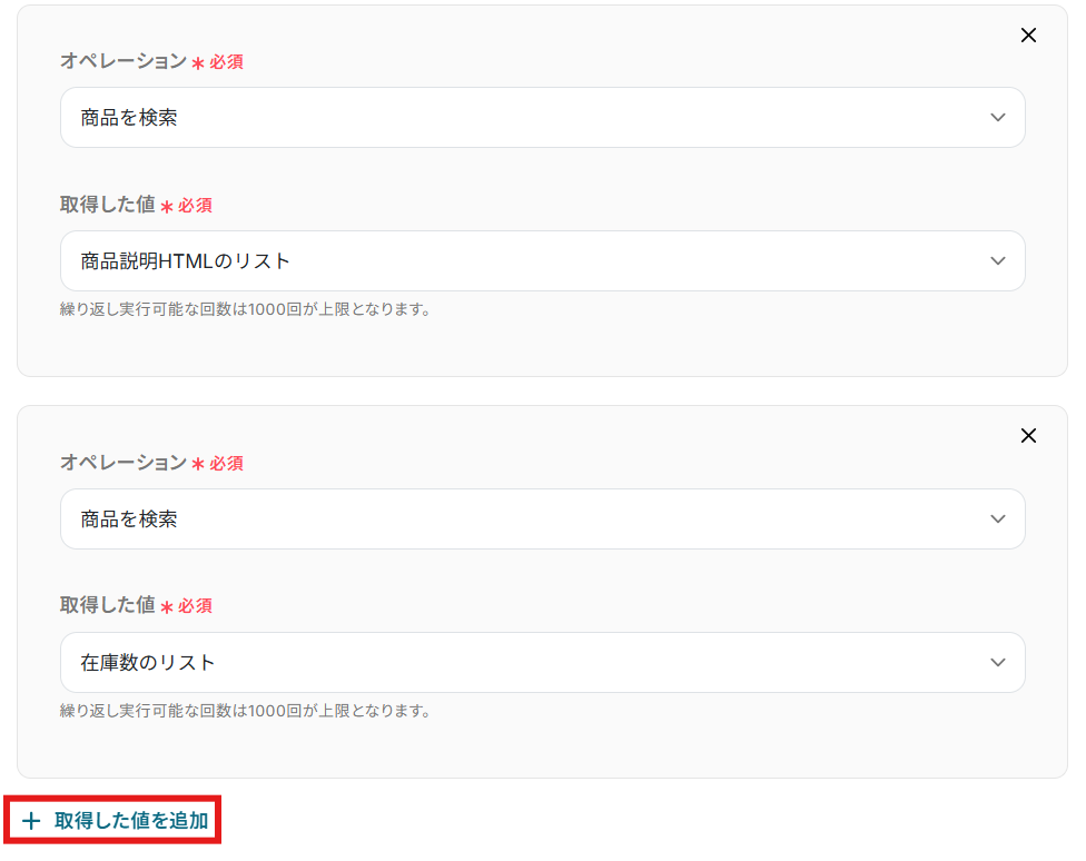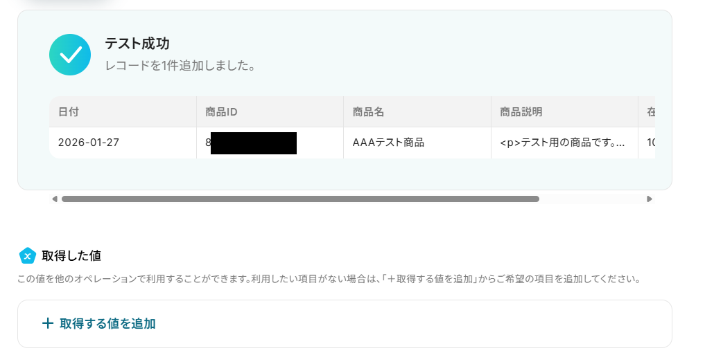 「取得した値」を設定しましょう。 Google スプレッドシートにレコードを追加する際に使用したい値を設定してくださいね。 今回は例として、「取得した値」に「商品IDのリスト」・「商品名のリスト」・「商品説明HTMLのリスト」「在庫数のリスト」を設定しました! 「+取得した値を追加」から「繰り返し対象の取得した値」を増やすことが可能です!
