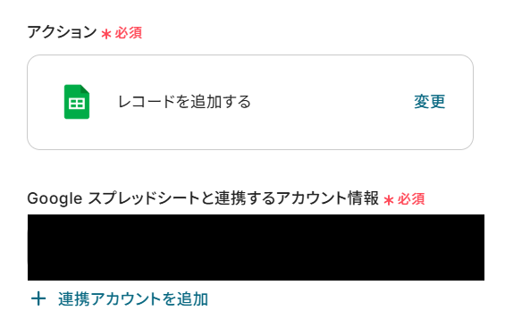 「アクション」はテンプレート通りのままでOKです! 「Google スプレッドシートと連携するアカウント情報」を確認してください。
