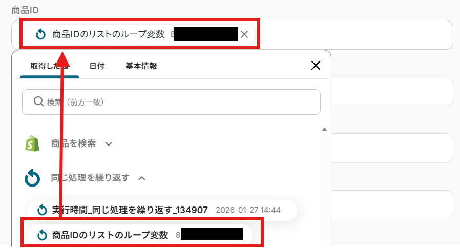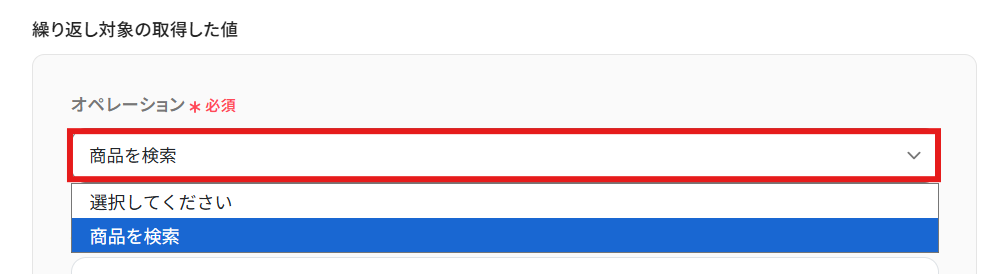 「繰り返し対象の取得した値」を設定しましょう。 「オペレーション」を「商品を検索」に設定します。