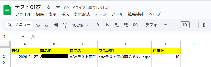 Google スプレッドシートにレコードが追加されました!※実際のフロー稼働時は、取得した商品分レコードが追加されます。