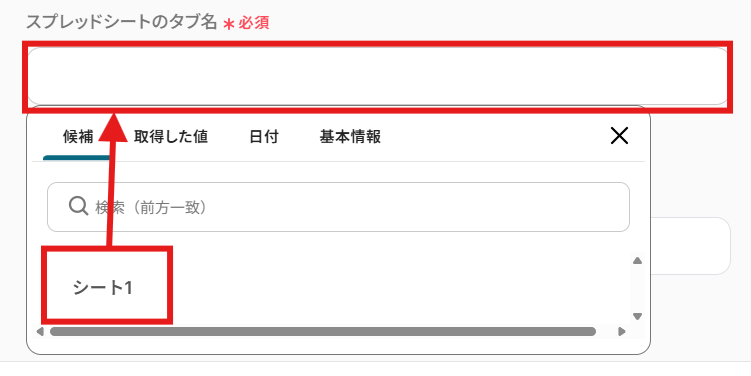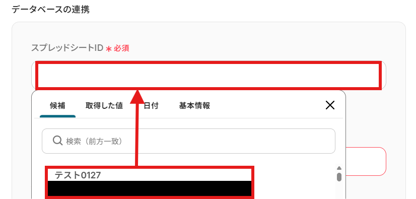 「データベースの連携」を設定します。 使用したいGoogle スプレッドシートの「スプレッドシートID」「スプレッドシートのタブ名」を候補から選択しましょう。