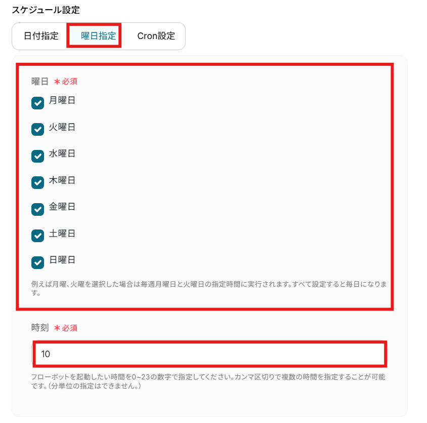 フローボットを起動させるスケジュールを設定しましょう。 「日付指定」「曜日指定」「Cron設定」が可能です。