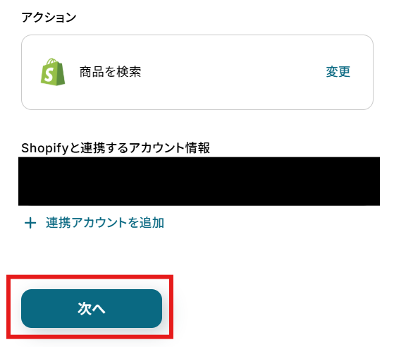 「アクション」はテンプレート通りのままでOKです! 「Shopifyと連携するアカウント情報」を確認し、「次へ」をクリックして進んでください。