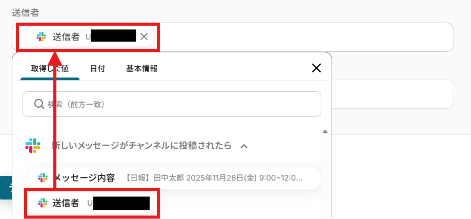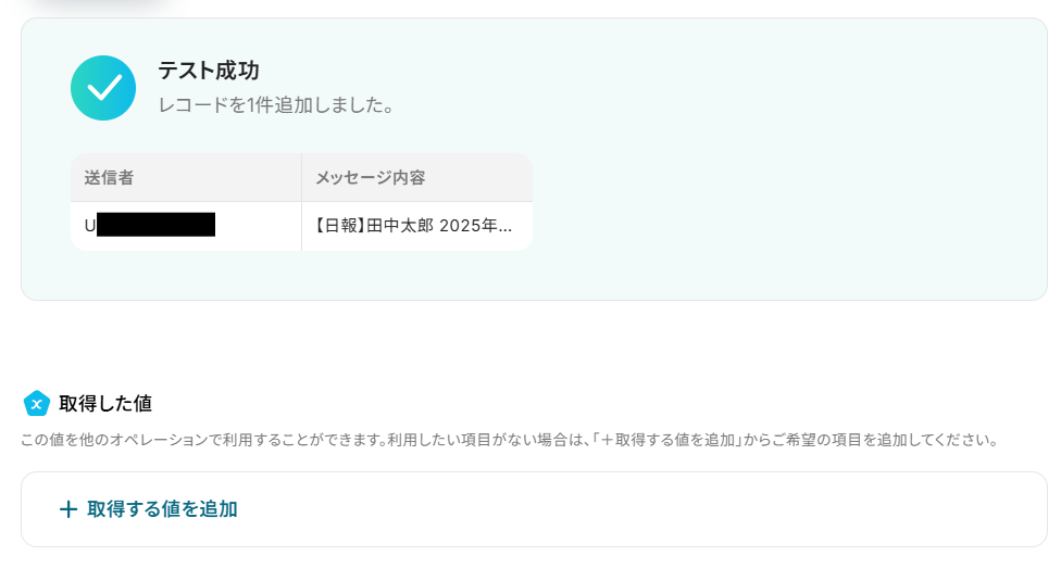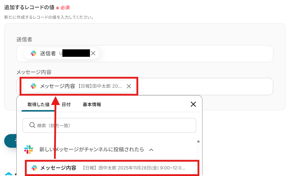 「追加するレコードの値」を設定しましょう。 「取得した値」の使用が可能です! 取得した値は変数となり固定値ではないため、トリガーが実行されるたびに取得した情報を反映できます。
