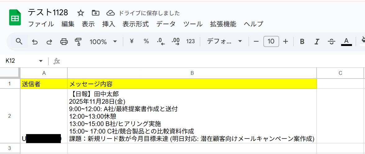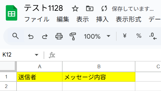 今回のフローで使用したいGoogle スプレッドシートの準備がまだの方はこのタイミングで作成しましょう。 例として以下のように作成しました!