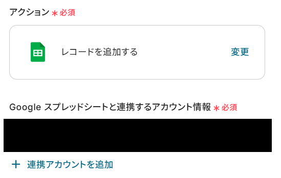 「アクション」はテンプレート通りのままでOKです! 「Google スプレッドシートと連携するアカウント情報」を確認してください。