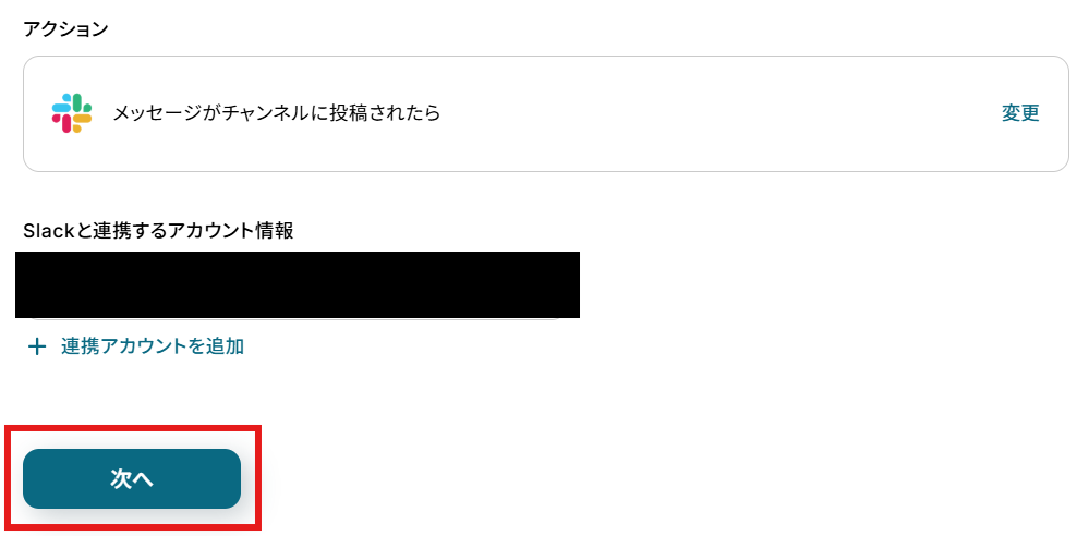 「アクション」はテンプレート通りのままでOKです! 「Slackと連携するアカウント情報」を確認し、「次へ」をクリックして進んでください。