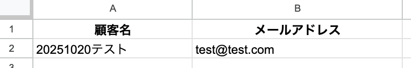 テストが成功したらGoogle スプレッドシートの画面を開き、実際にレコードが追加されているかを確認してみましょう。今回は下記のとおり作成されていました!