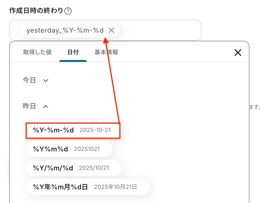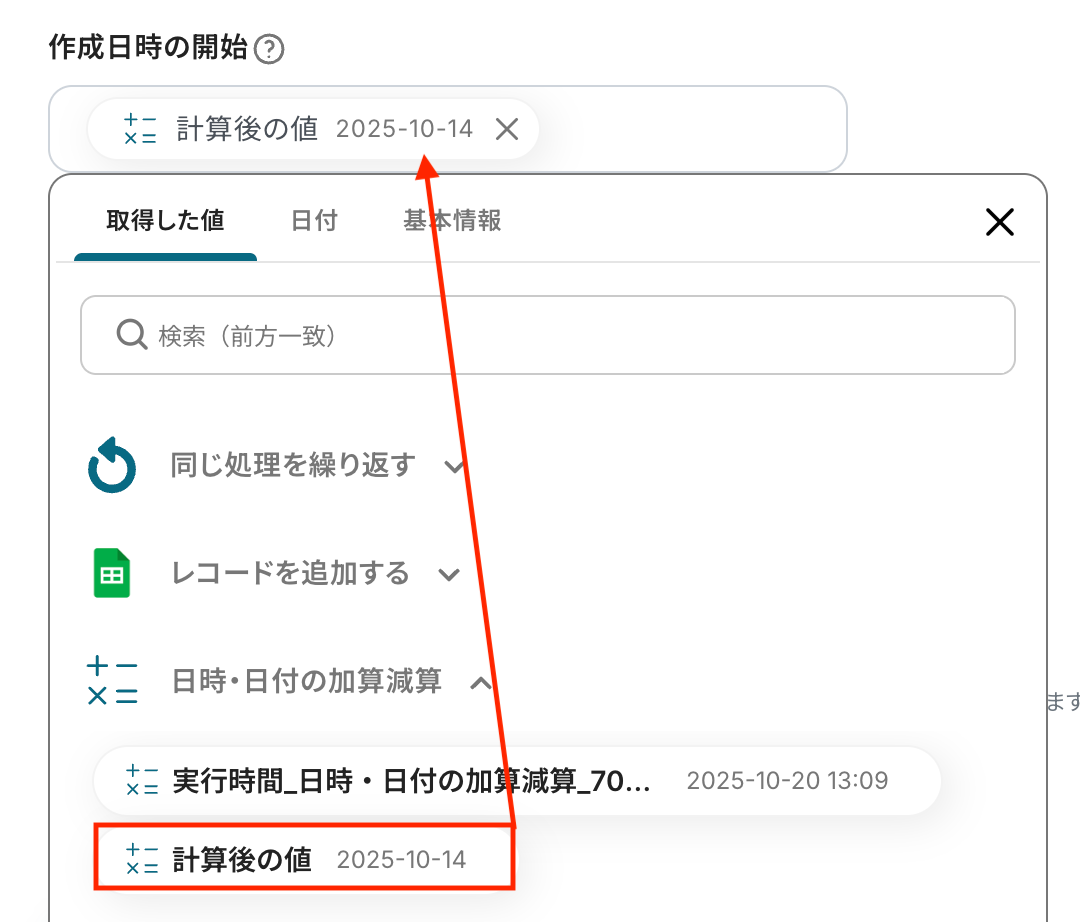 こちらも作成日時の開始と同様に、入力欄をクリックすると取得した値が表示されるので選択して入力が可能です。