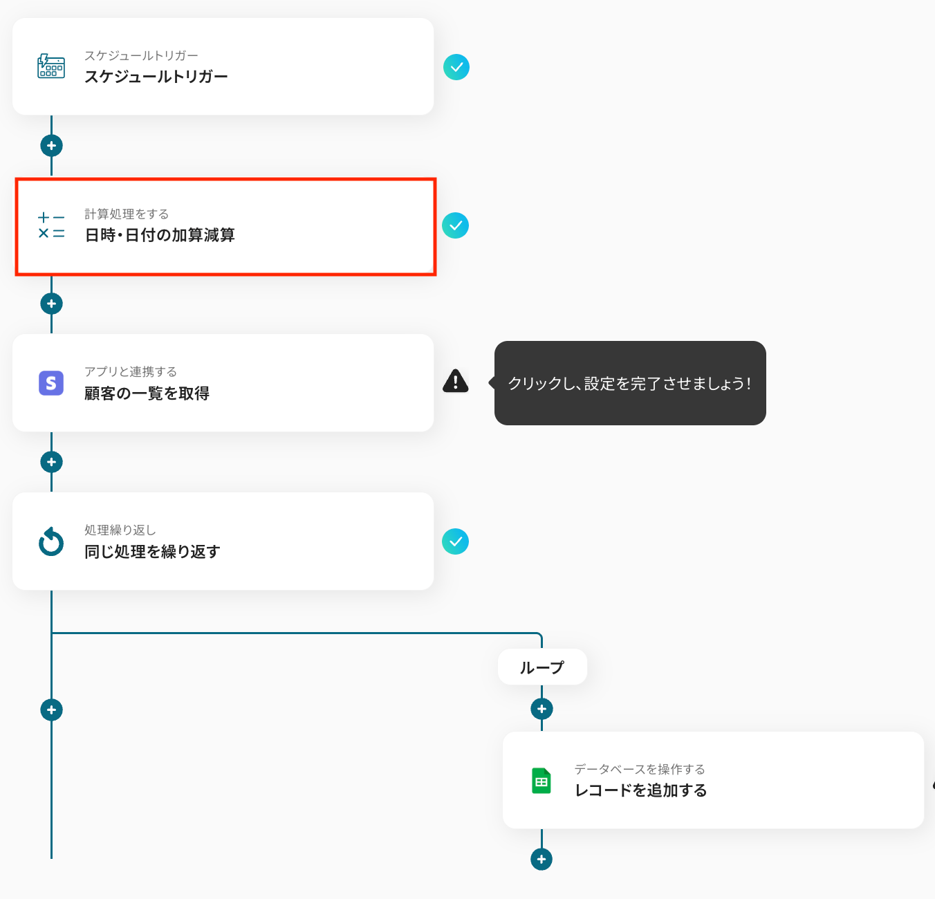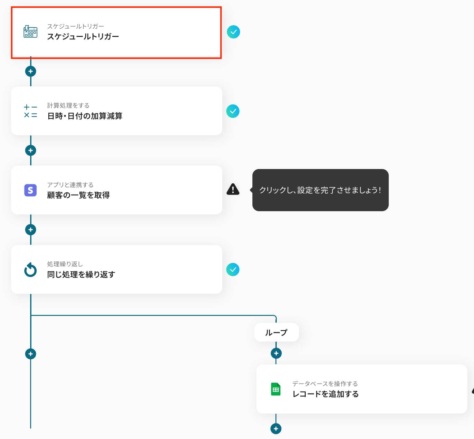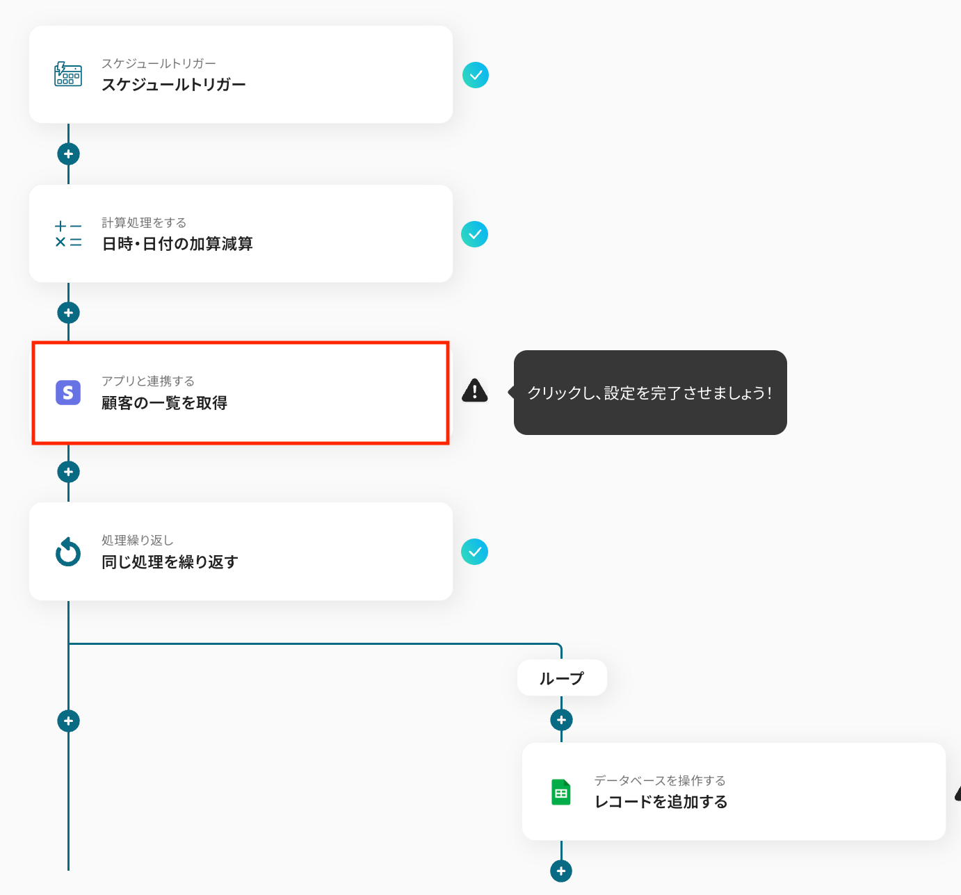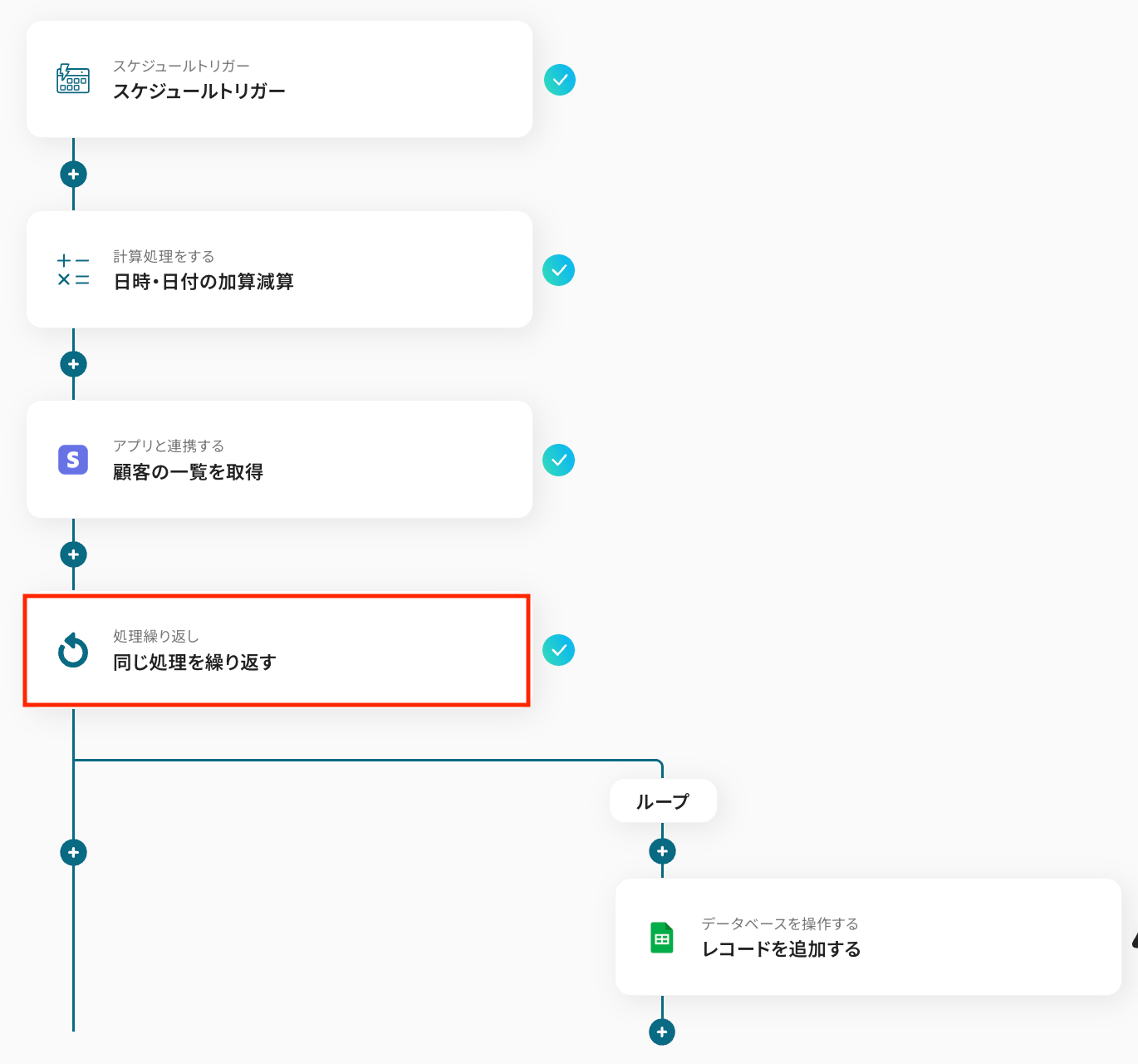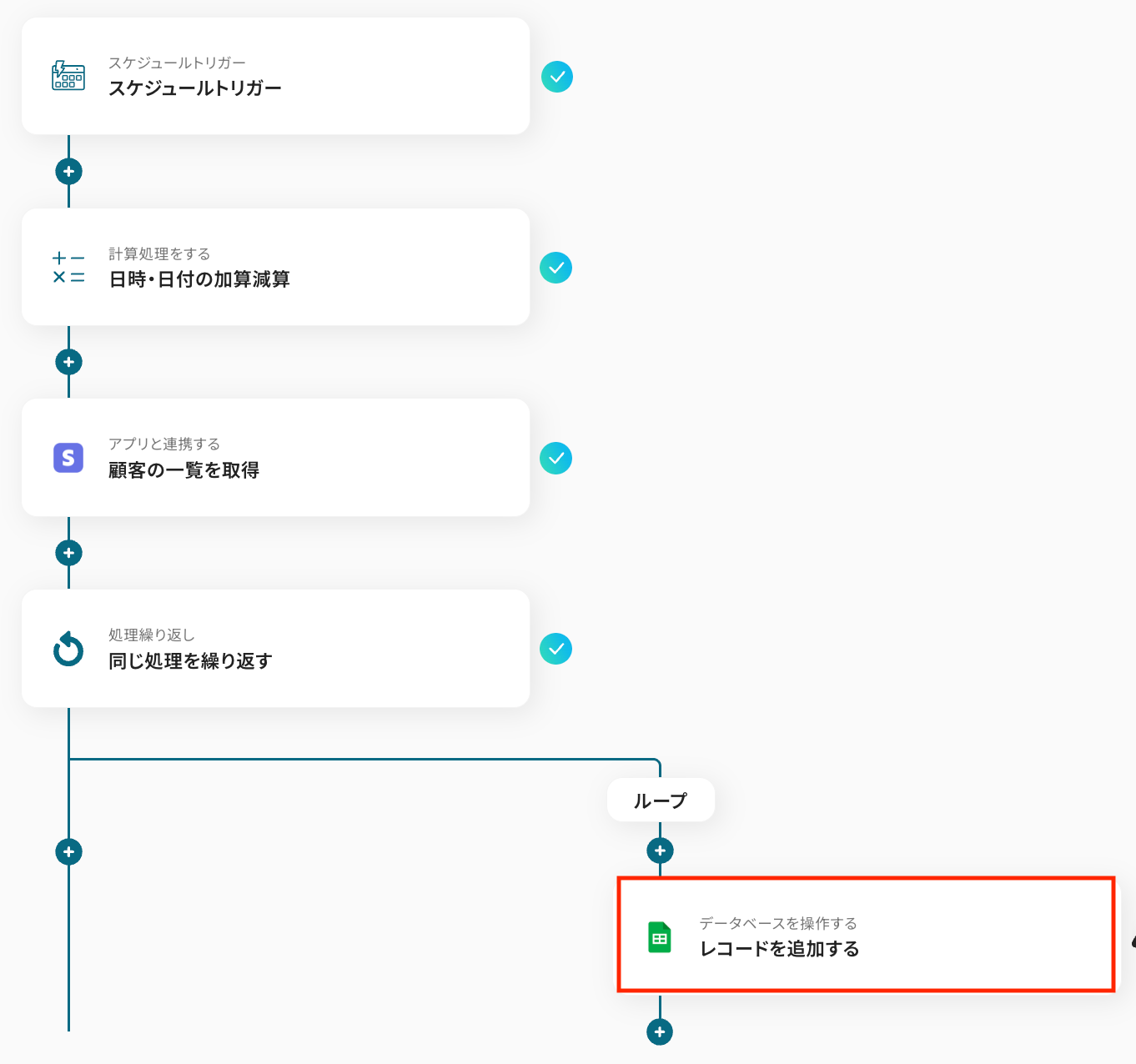 この設定により、Stripeでまとめて取得した複数の顧客一覧情報に対して同じ処理(今回はGoogle スプレッドシートへのレコード追加)を順番に実行できるようになります。