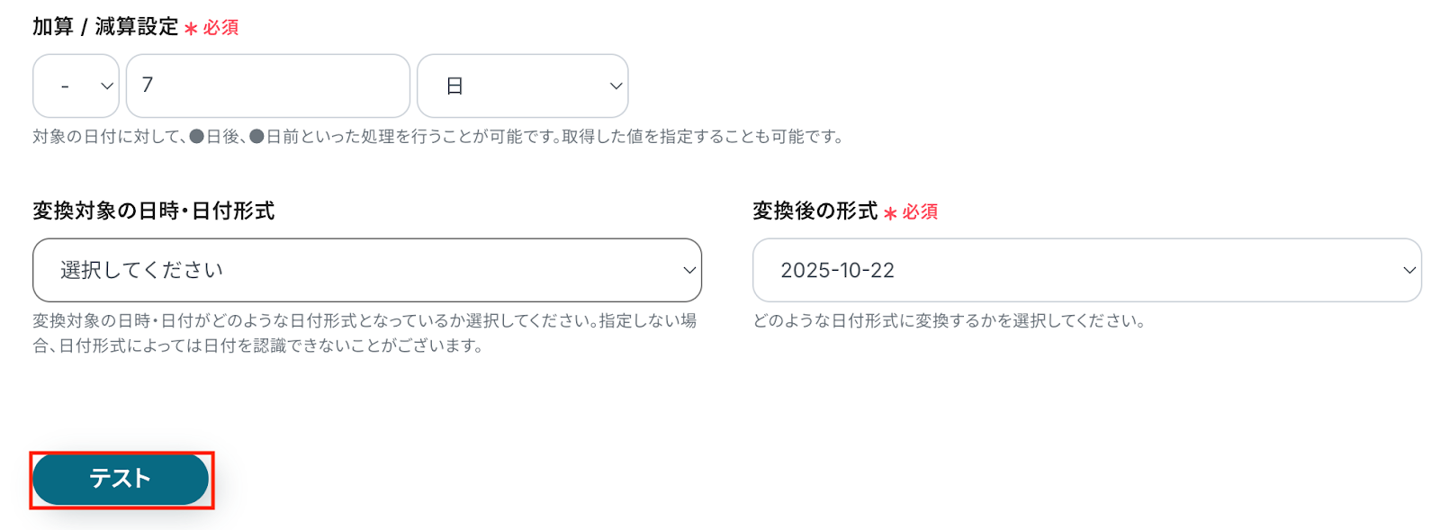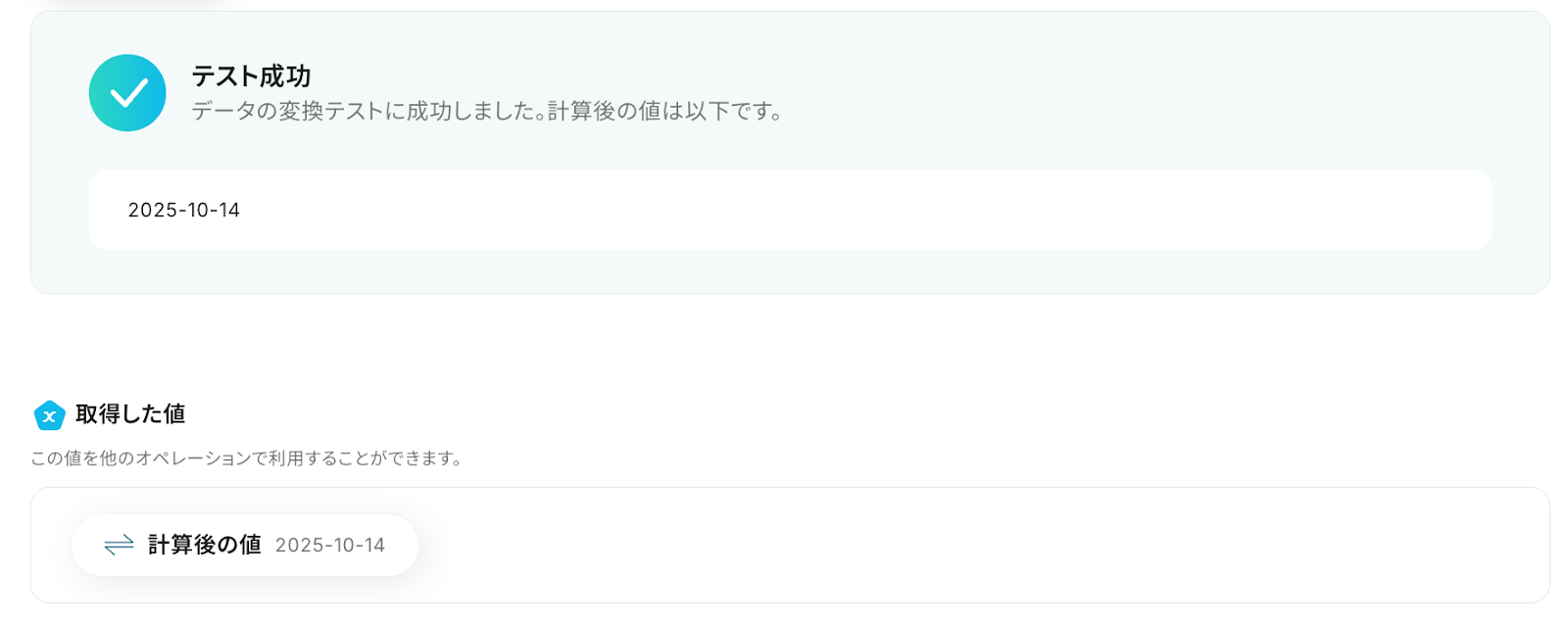 指定した内容に基づき日付データが正しく取得されるか確認するため、「テスト」をクリックしましょう。
