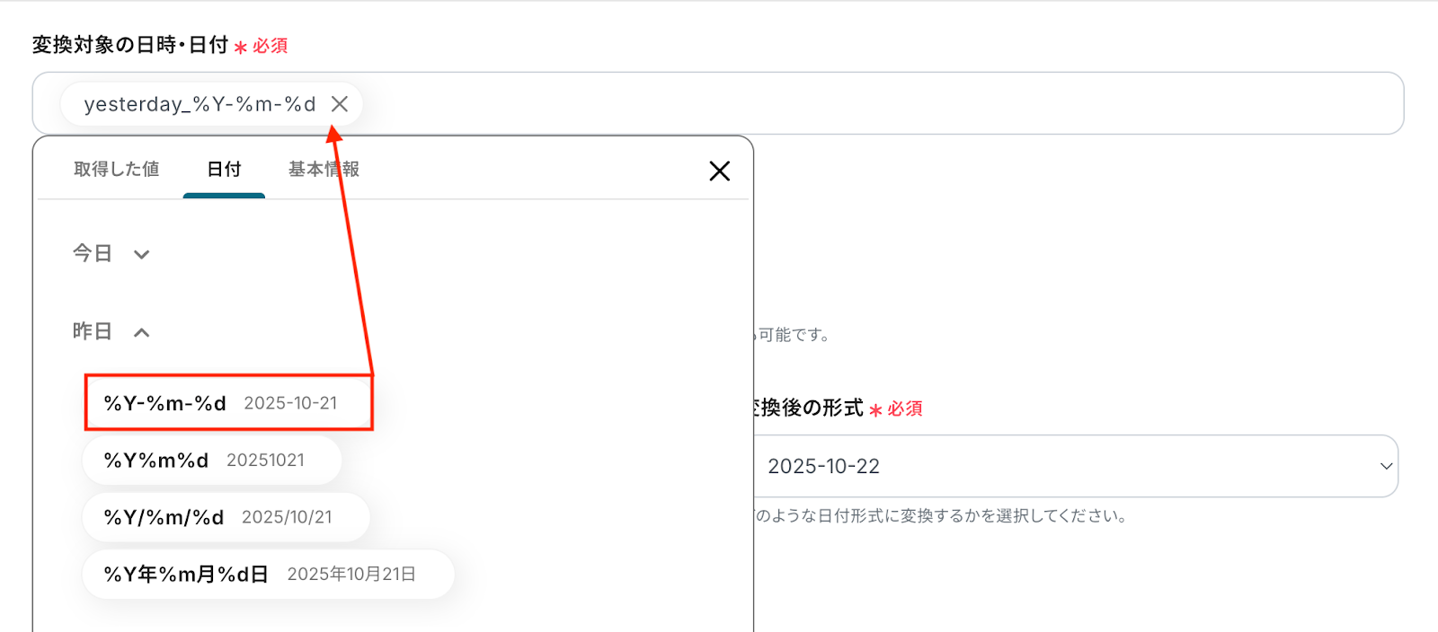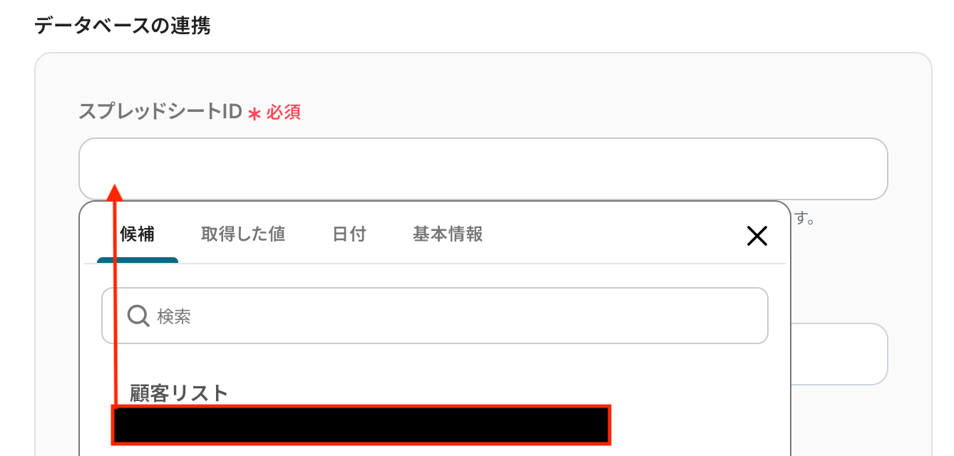 入力欄をクリックすると、前のステップで取得した値が表示されるので、選択して入力しましょう。