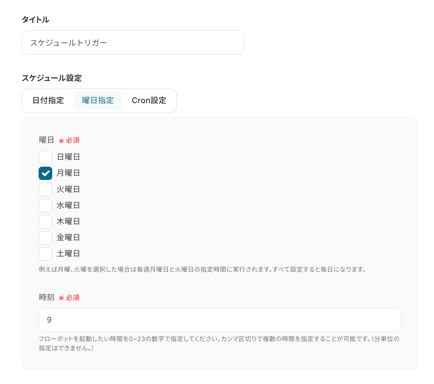 また、「曜日指定」や「Cron設定」を利用することで、より細かいスケジュール設定も可能です。