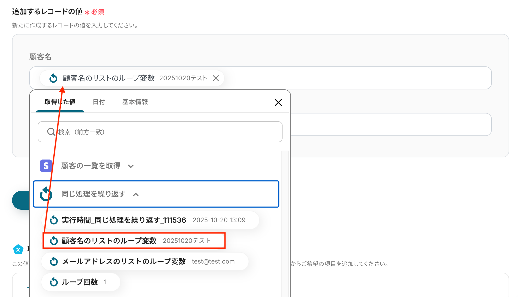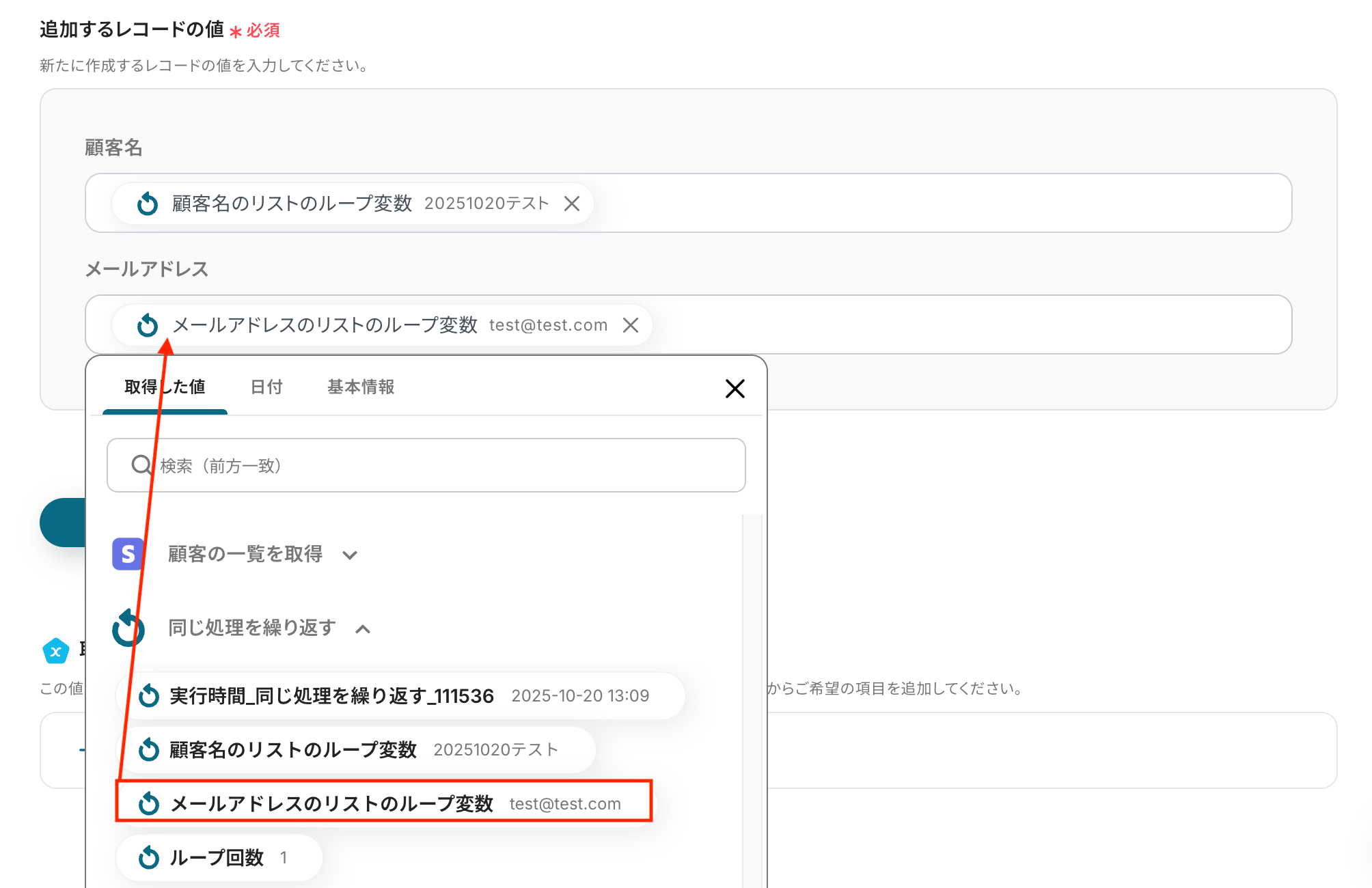 入力欄をクリックすると、前のステップ「同じ処理を繰り返す」から取得した値が表示されるので選択して入力しましょう。