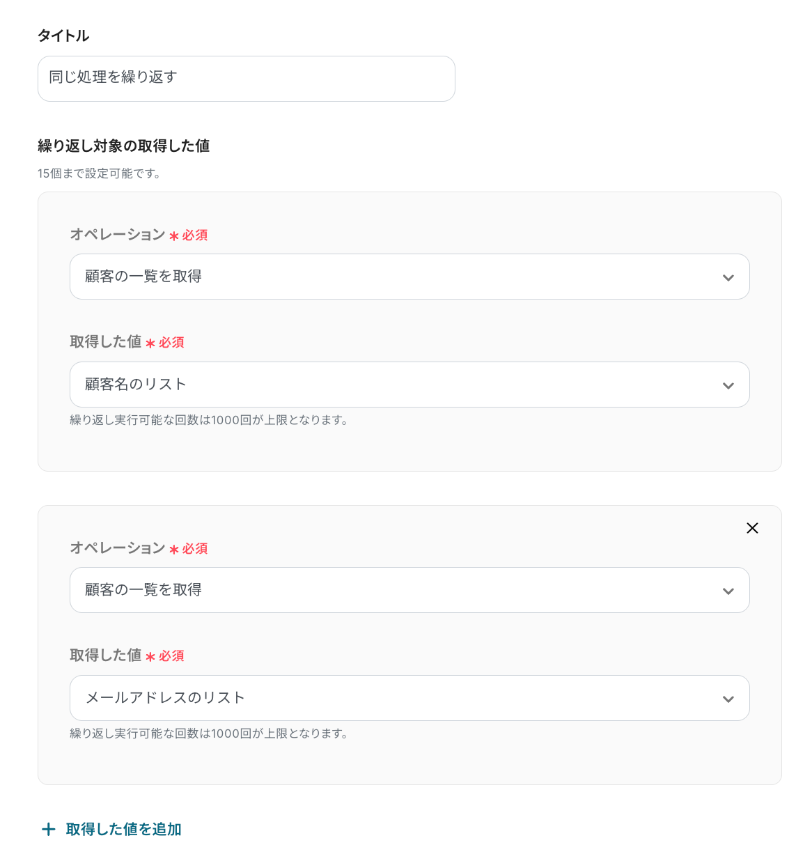 続いて、前のステップでStripeから取得した顧客の一覧を1件ずつ処理するため、「同じ処理を繰り返す」設定を行いましょう。