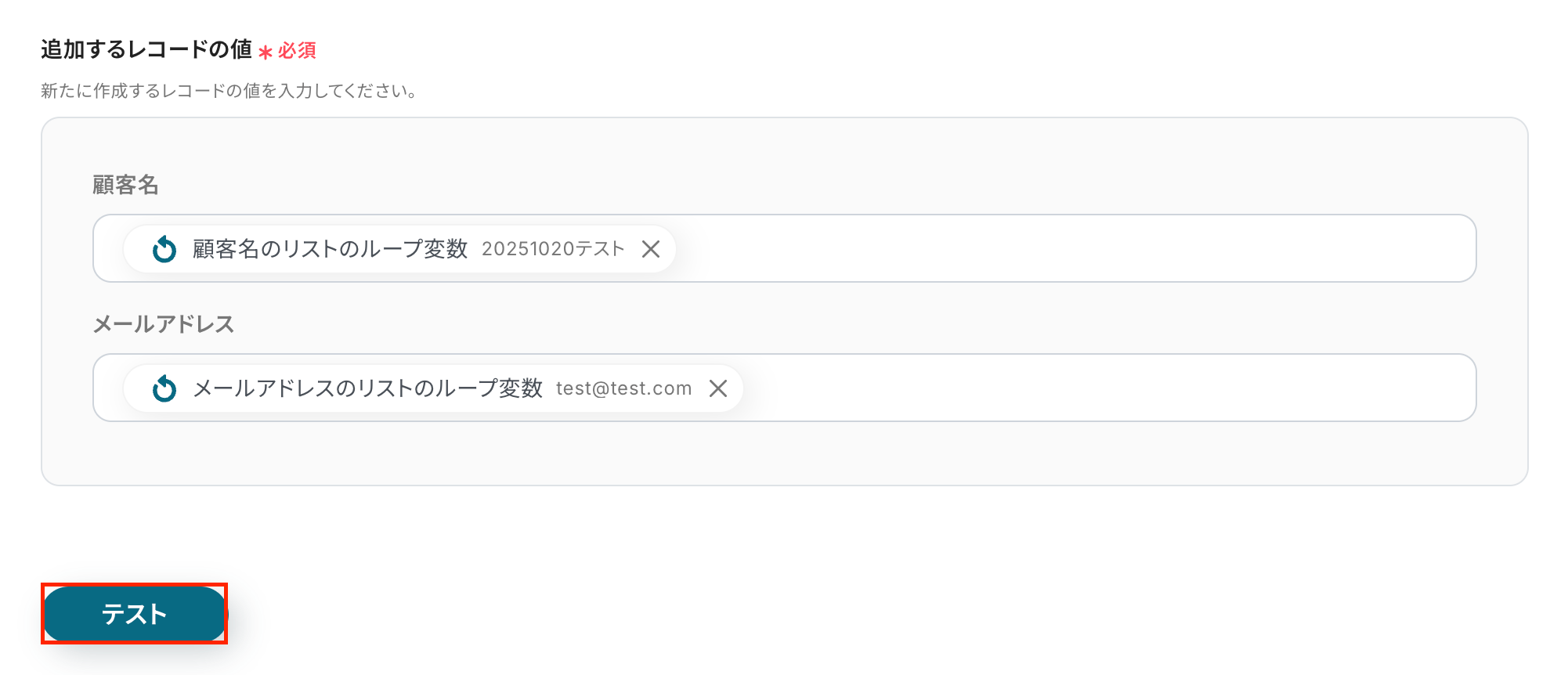 それぞれの項目について入力が完了したら、「テスト」をクリックして、設定した内容でGoogle スプレッドシートにレコードが追加されるか確認しましょう。