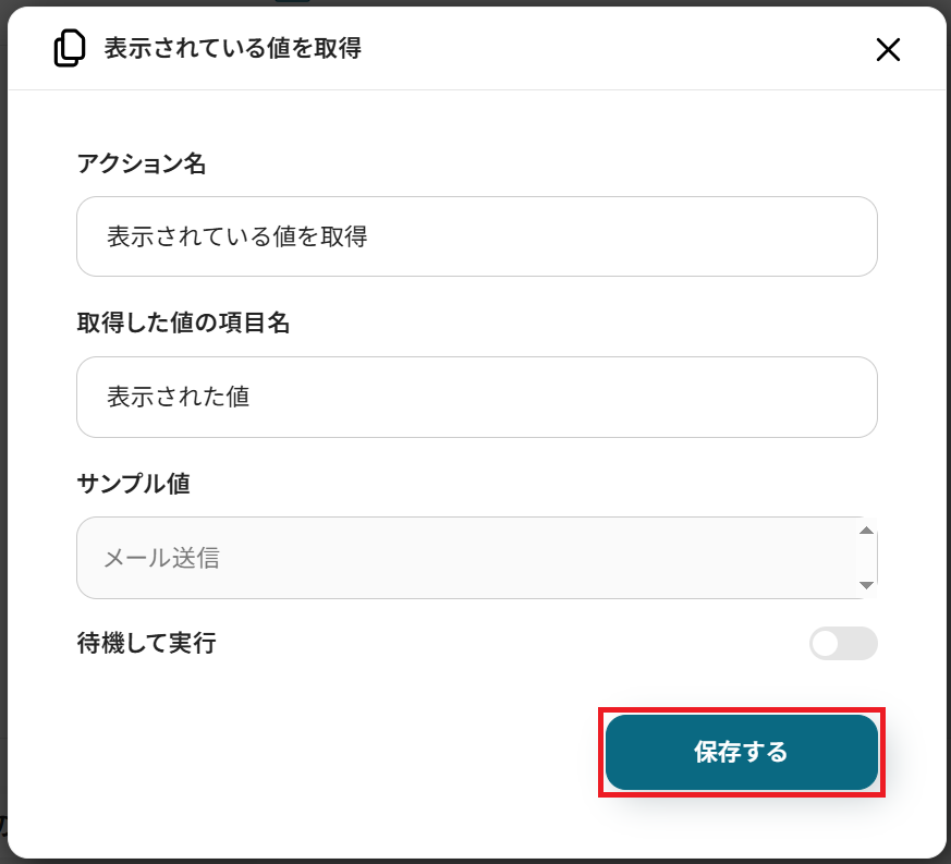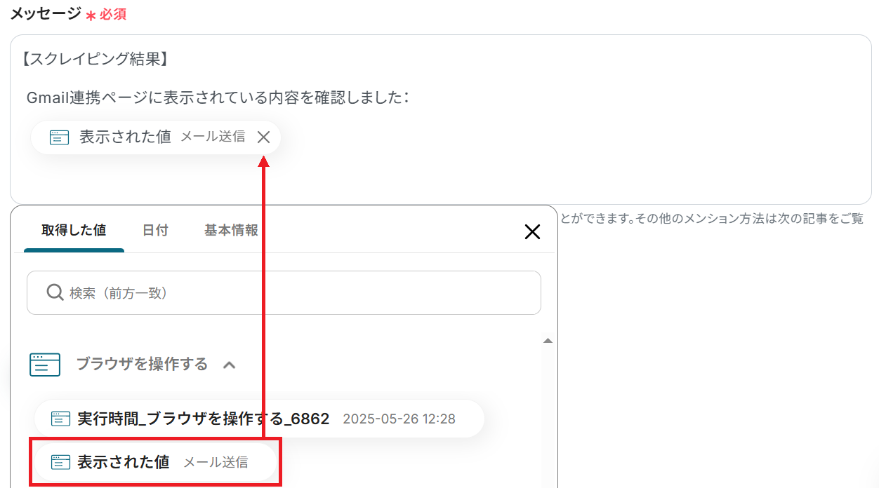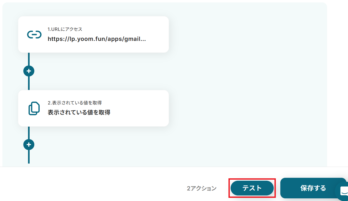 これにより、Webページ内の特定のテキスト情報(今回は「メール送信」)をYoomが取得し、それをフロー内で使えるようになります。
