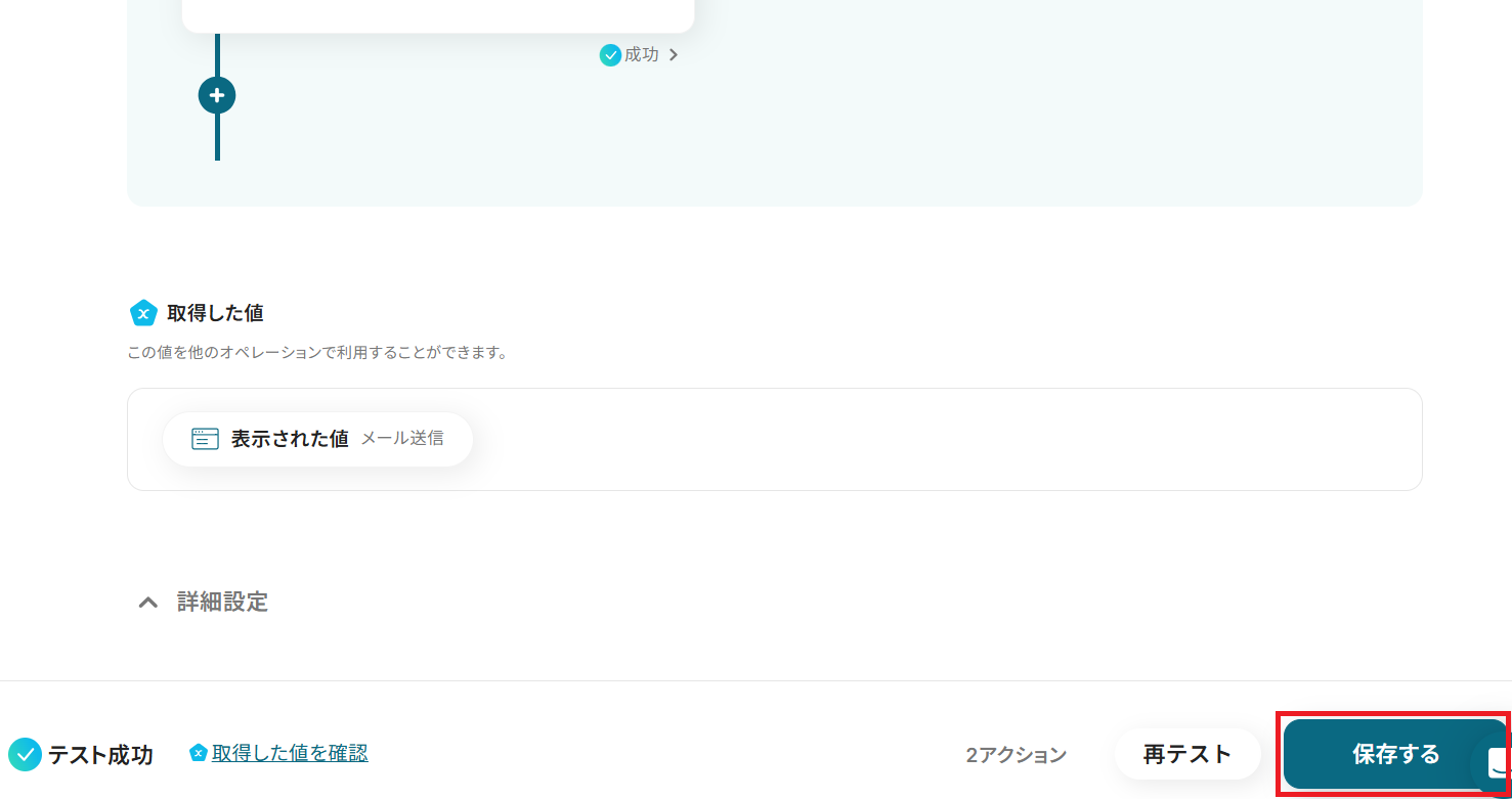 成功したら保存しましょう。ここで取得したアウトプットの値は次のステップで活用できます。