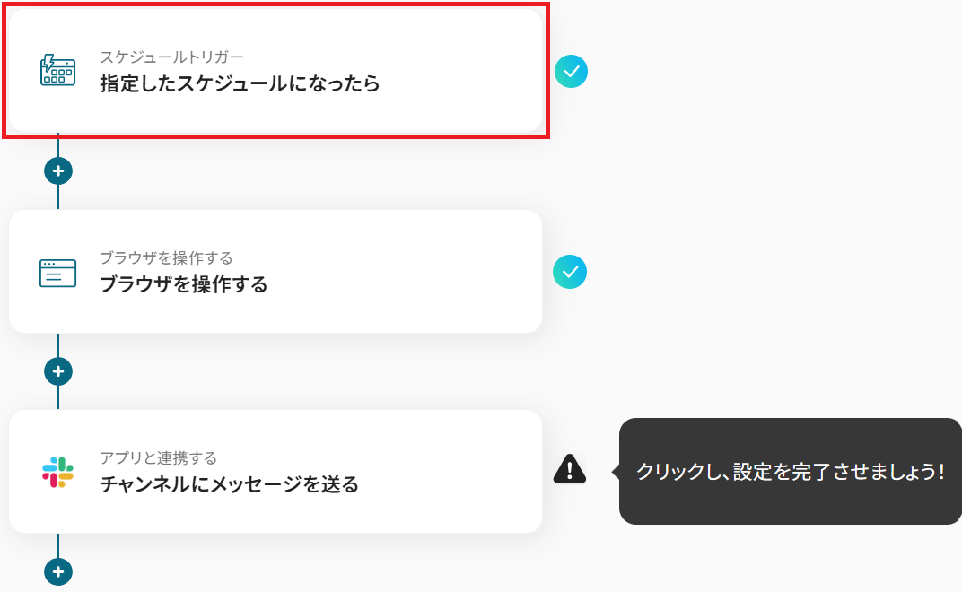 - スケジュールトリガーの設定、スクレイピング対象サイトの設定、Slackのアクション設定