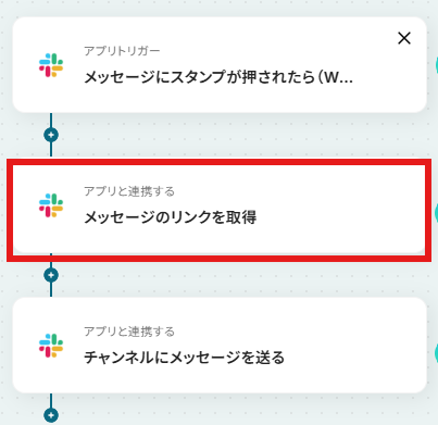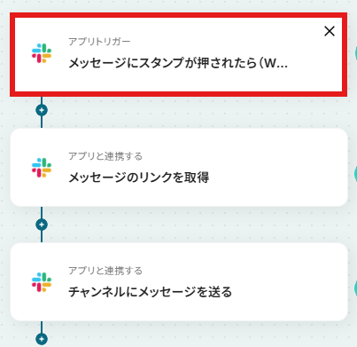 はじめに、SlackをYoomと連携します 次に、トリガーでSlackを選択し、「メッセージにスタンプが押されたら(Webhook)」というアクションを設定します その後、オペレーションでSlackの「メッセージのリンクを取得」アクションを設定し、トリガーで検知したメッセージのリンクを取得します 最後に、同じくオペレーションでSlackの「チャンネルにメッセージを送る」アクションを設定し、取得したリンクを指定のチャンネルに送信します ※「トリガー」:フロー起動のきっかけとなるアクション、「オペレーション」:トリガー起動後、フロー内で処理を行うアクション■このワークフローのカスタムポイント