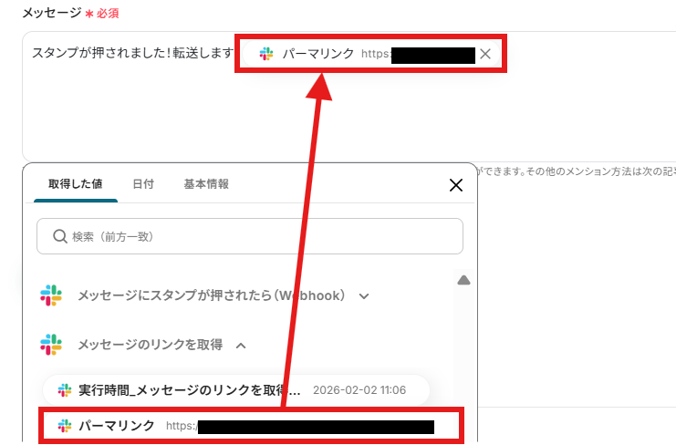 メッセージ内容は以下のように設定しています。取得した値も使えますので、メッセージのパーマリンクを必ず含めてください。