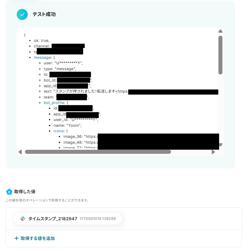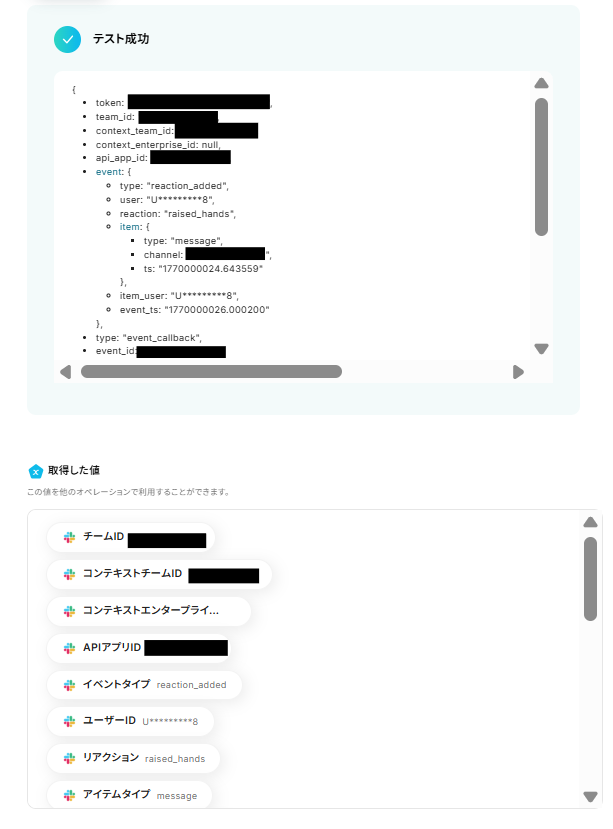 メッセージにスタンプを押したら設定画面に戻り、テストボタンをクリックしてください。 テストが成功すると、取得した値が入ります。これでSlackのメッセージにスタンプを押されたときにトリガーが起動するようになります。