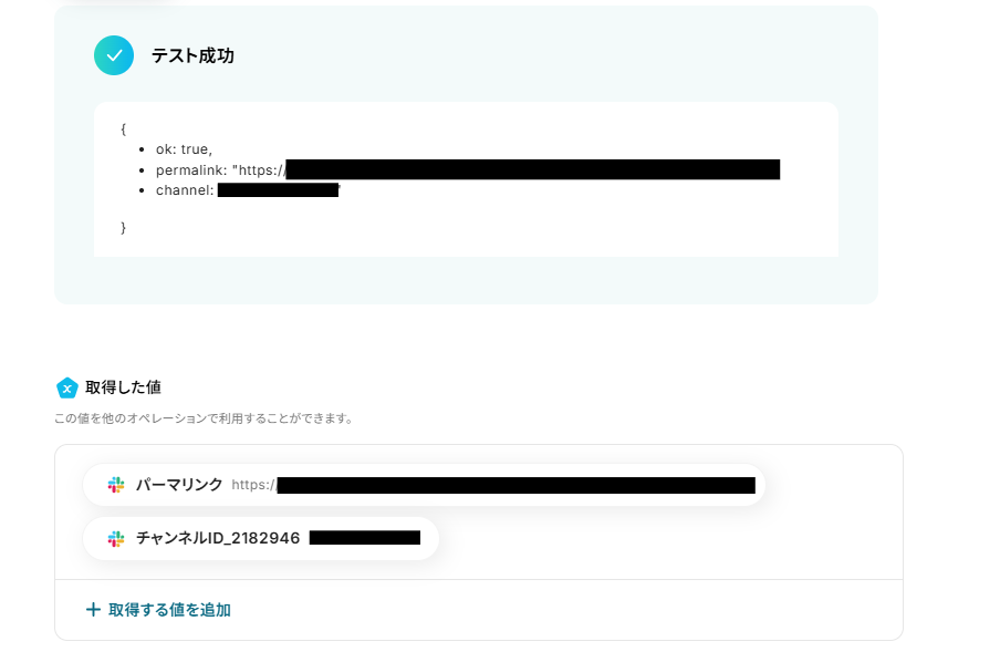 テストボタンをクリックしましょう。テストが成功すると該当メッセージのリンクが取得されます。