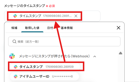 タイムスタンプを前ステップで取得した値から入力します。 取得した値を活用することで、固定値ではなく、トリガーが実行されるたびに最新の情報が反映できます。