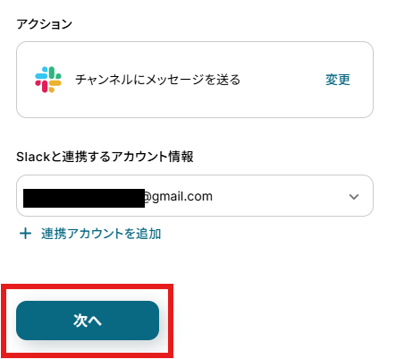 アクションはデフォルト設定のまま、アカウント情報は、連携したいアカウントが選択されているか確認してください。確認が終わったら「次へ」で進みましょう。