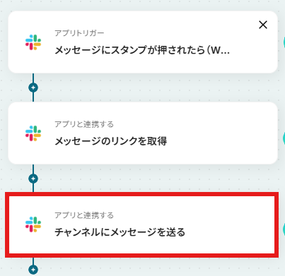 ステップ5:指定のSlackチャンネルにメッセージURLを転送する 最後に指定のSlackチャンネルにメッセージURLを転送します。「チャンネルにメッセージを送る」をクリックしてください。