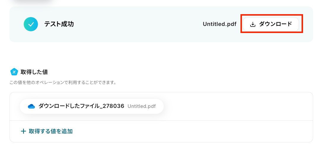 アップロード後はYoomの画面に戻り、「テスト」をクリックします。 テストが成功すると、先ほどアップロードしたファイルの情報が「取得した値 」に追加されるので、内容を確認しましょう。