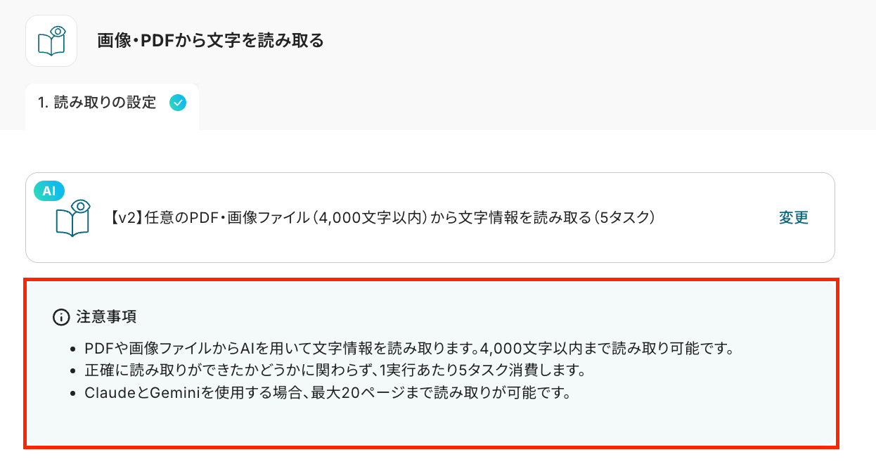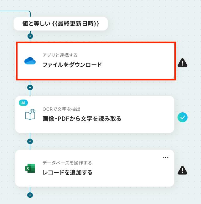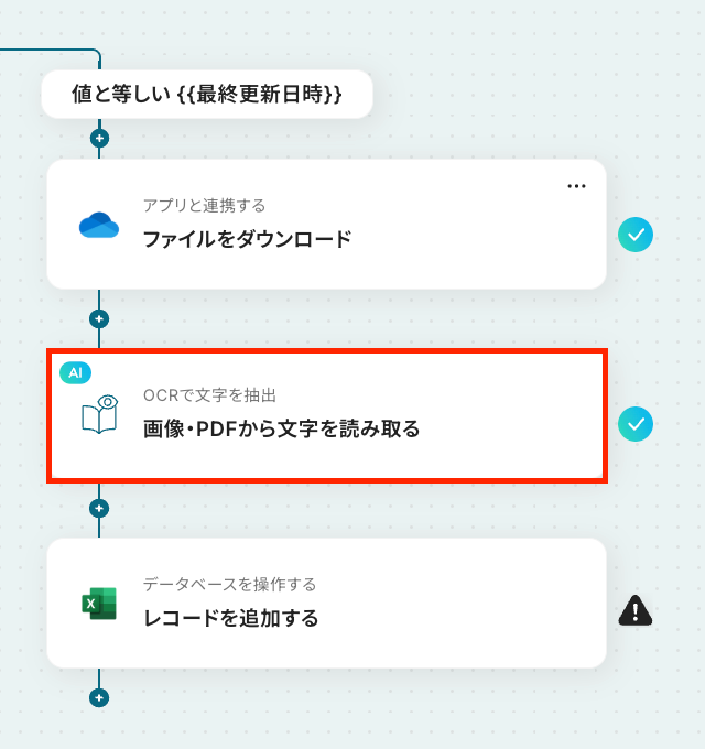 ステップ6:画像・PDFから文字を読み取る設定(OCR機能) 続いて、ステップ5でダウンロードしたファイルデータから、OCR機能を使って文字を読み取る設定を行います。 ここで抽出したテキストデータを使って、Microsoft Excelにデータを追加していきますよ!