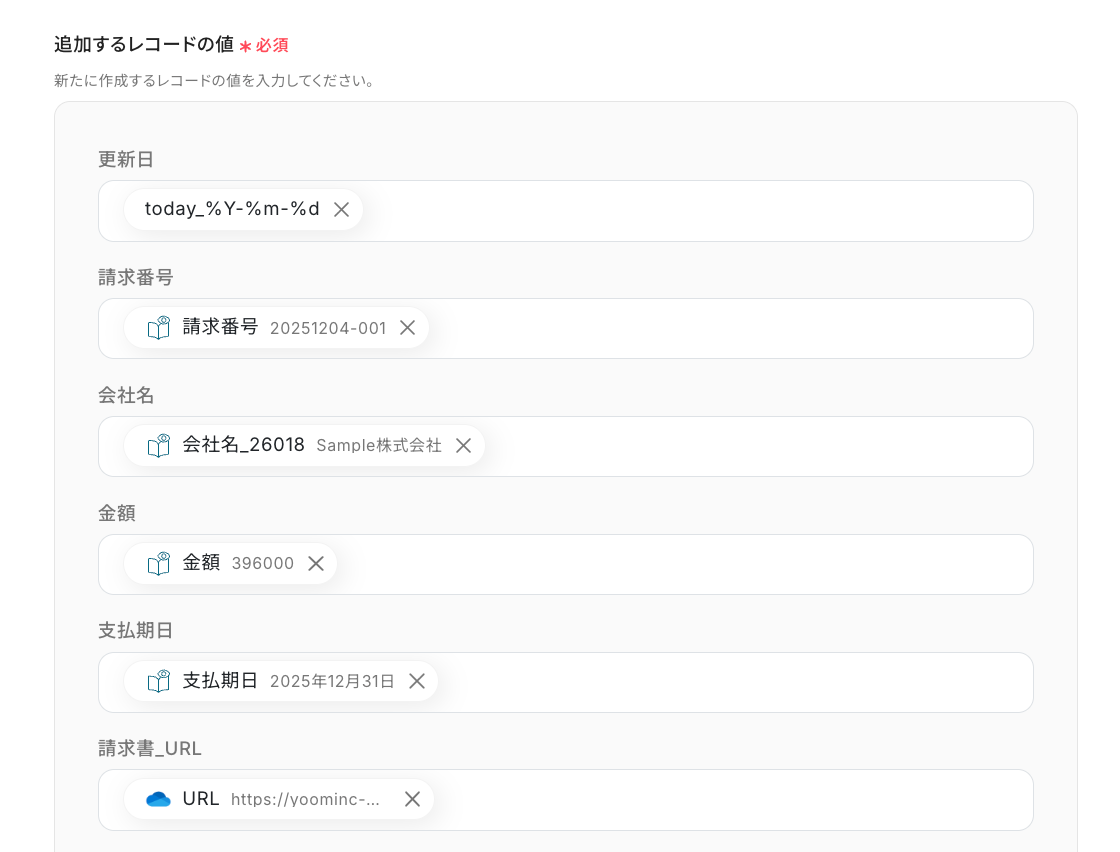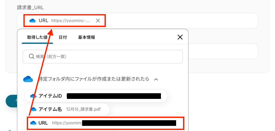 「請求書URL」は、「取得した値」の「特定のフォルダ内にファイルが作成または更新されたら」内にある「URL」を設定しました!