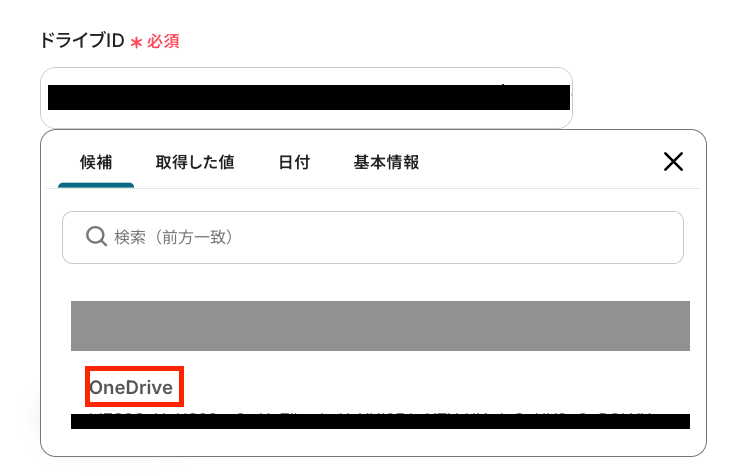 2.ドライブID 入力欄をクリックして表示される候補から、フローで使用する該当のものを選択しましょう。 候補は、連携しているOneDriveアカウントに紐づいた情報が表示されますよ!
