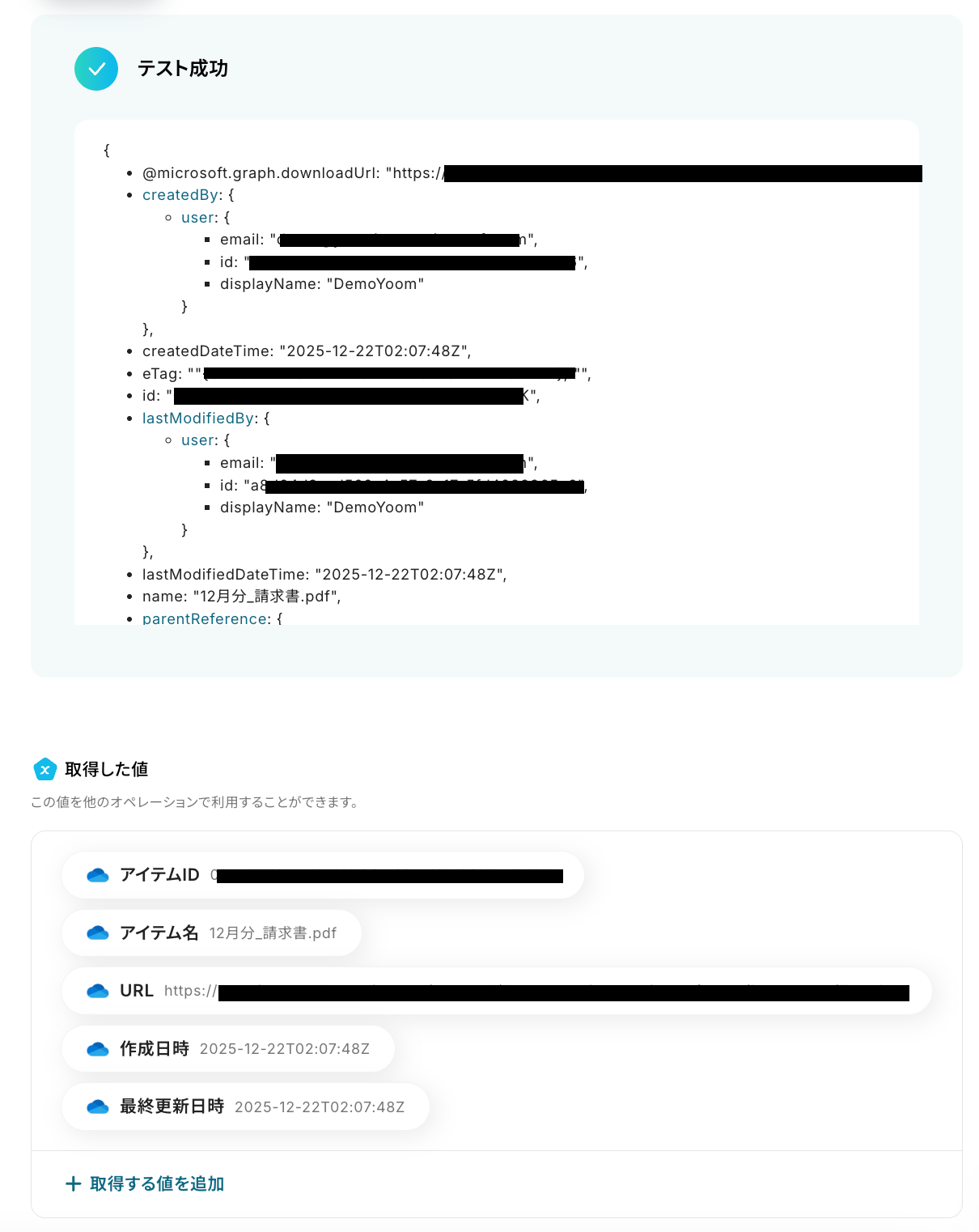 ここで取得した値は後続のオペレーション設定時に引用でき、フローを起動する度に変動する値となります。 テストが成功し、取得した値が正しく追加されていることを確認したら「完了」を押して、次のステップに進みましょう!