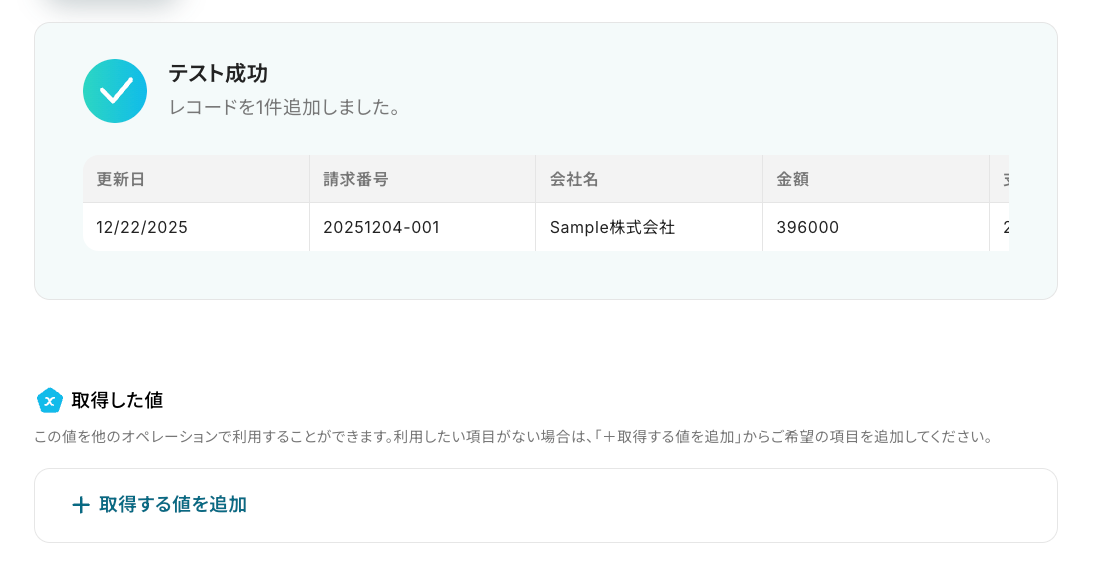 「テスト成功」と表示されると、先ほど「追加するレコードの値」の各項目に設定したそれぞれの値が実際に追加されているはずなので、確認してみてくださいね!