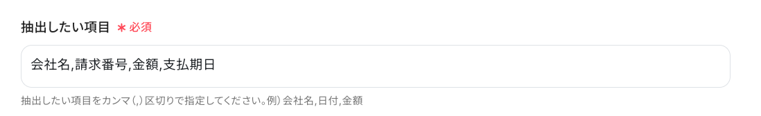 3.抽出したい項目 OCR画像に設定したファイルから、抽出したいテキストデータの項目を設定します。 こちらはMicrosoft Excelにデータを追加する際に必要な項目を、すべて設定しておくようにしましょう。 抽出項目が複数ある場合は、カンマ(,)区切りで入力してくださいね!
