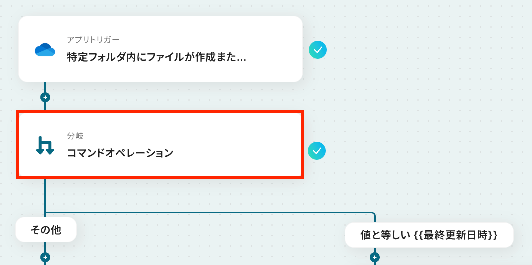 この「分岐する」オペレーションを設定することで、OneDrive内のファイルが「更新」された際はMicrosoft Excelに追加せず、新たにファイルが「作成」された場合にのみ後続のアクションに進むようになりますよ!