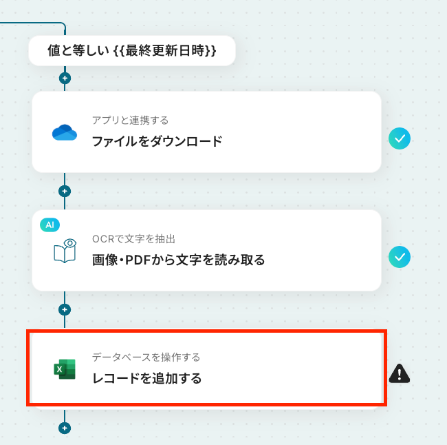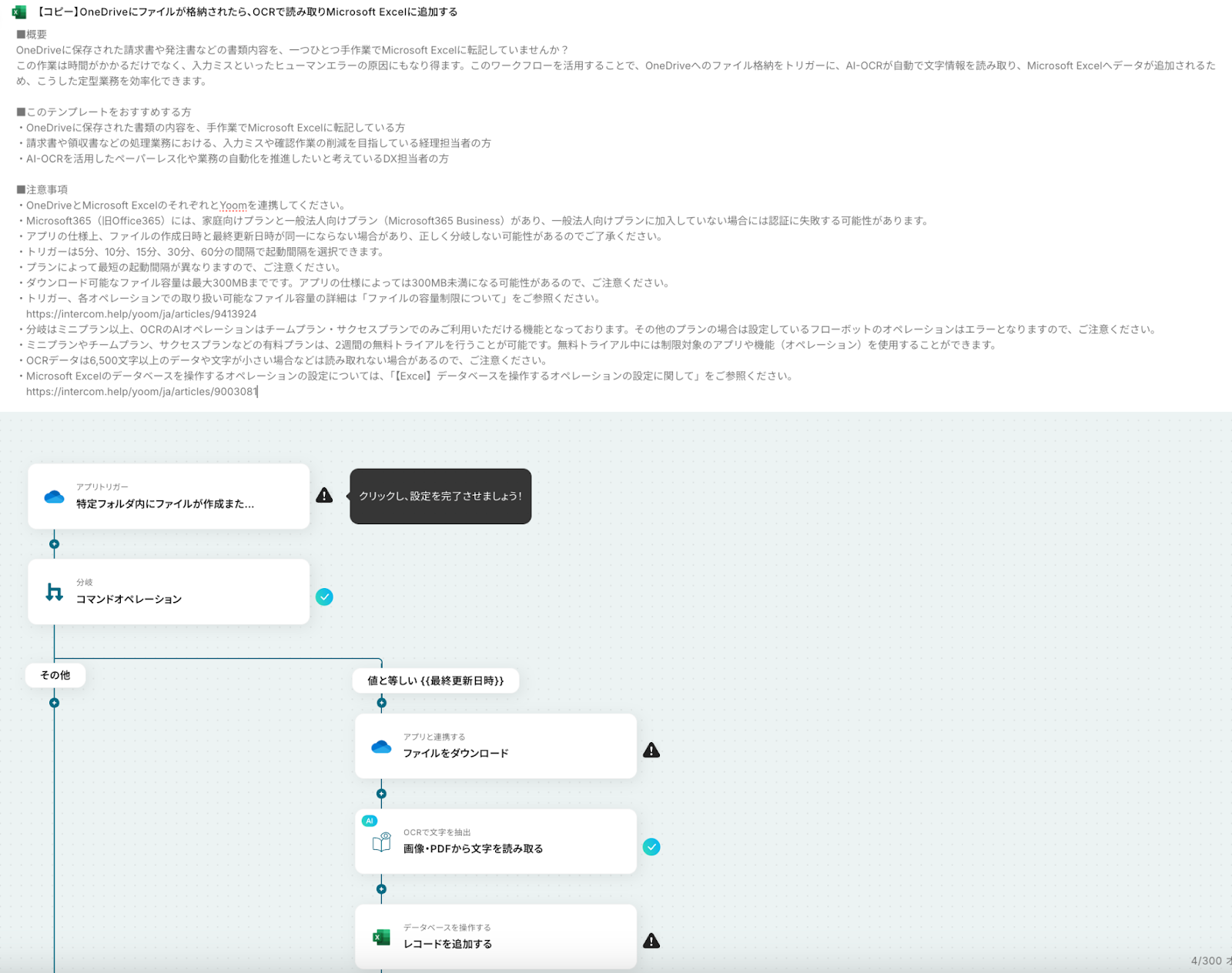 OneDriveのトリガー設定では、対象としたいフォルダを任意で設定してください。 AI-OCRで文字を読み取るアクションでは、読み取り対象のファイルや、抽出したい項目、言語などを任意で設定してください。 Microsoft Excelにレコードを追加するアクションでは、連携するデータベースや、追加したいレコードの値を任意で設定してください。 ■注意事項