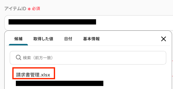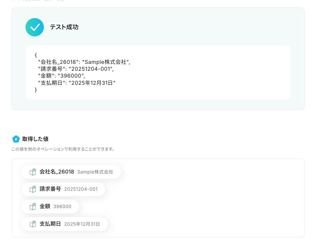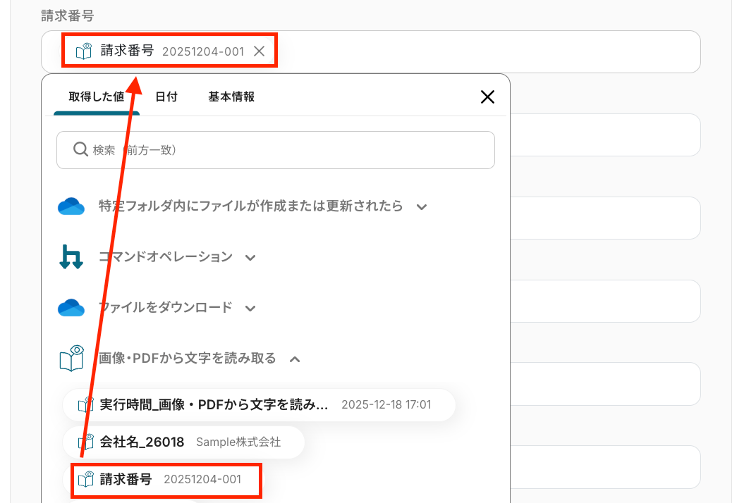 「請求番号」には、「取得した値」の「画像・PDFから文字を読み取る」内にある、「請求番号」を設定しましょう。