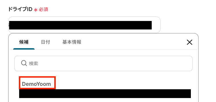 1.ドライブID ステップ3同様に、フローで使用する該当のものを候補から選択しましょう。 こちらはステップ3で設定したドライブIDと同じものを設定するようにしてくださいね!
