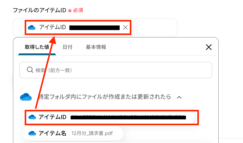 2.ファイルのアイテムID OneDriveからダウンロードするファイルを指定します。